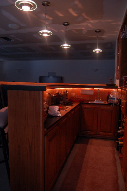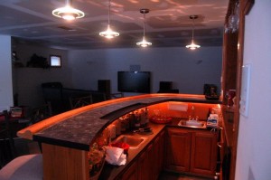 On occasion, our site members really impress us with their handiwork. This unique curved oak bar rail and bar was built by Dennis S., clearly one of our more experienced and adventurous woodworking members. The curved seating arrangement allows his guests to see each other without having to suffer neck strain. It’s a great idea, but most importantly the final result is a beautiful bar that is sure to impress everyone. Although we try to keep our designs as simple as possible, we are currently working up several variations of curved and round bar designs.